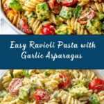 2. Sauté the Vegetables: While the ravioli cooks, heat olive oil in a large skillet over medium heat. Add minced garlic and sauté for 1-2 minutes until fragrant. Add halved cherry tomatoes and cut asparagus pieces and cook for 5-6 minutes until vegetables are tender and tomatoes release their juices.