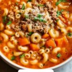 This hearty Beef & Tomato Macaroni Soup recipe combines ground beef, tomatoes, and tender elbow macaroni in a flavorful broth. Perfect for a comforting meal, this one-pot soup is seasoned with smoked paprika, Italian herbs, and garnished with fresh parsley and Parmesan cheese to elevate its taste.