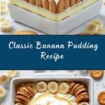 4. Layer Ingredients: In a 9×13-inch baking dish, spread a layer of vanilla wafer cookies evenly to cover the bottom. Add a layer of sliced bananas on top of the wafers, then spread half of the pudding mixture over the bananas, smoothing it evenly.