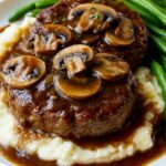 Immediately serve the Salisbury steaks smothered in mushroom gravy, ideally over creamy mashed potatoes or another comfort-food favorite. Every bite bursts with that incredible combination of savory beef, tangy undertones, and rich earthiness. This moment is why you made the Bobby Flay Salisbury Steak Recipe—pure satisfaction on a plate!