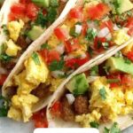 - Assemble Tacos: Divide the scrambled eggs evenly among the warmed tortillas. Sprinkle each with shredded cheese and then top with cooked sausage or bacon, diced tomatoes, onions, chopped cilantro, sliced avocado, salsa, and hot sauce according to your taste preference.