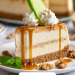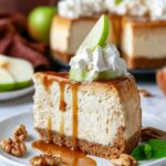 - Finish with Toppings: Top the cheesecake with the caramelized cinnamon apples, drizzle additional caramel sauce over the top as desired, and pipe or dollop the cinnamon whipped cream decoratively to finish.