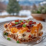 A comforting and hearty Cheesy Loaded Meatloaf Casserole featuring a flavorful meatloaf base topped with creamy mashed potatoes, melted cheddar cheese, crispy bacon, and fresh green onions. This easy-to-make casserole combines the classic meatloaf flavors with a creamy, cheesy twist, perfect for family dinners.