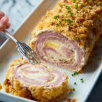 This Chicken Cordon Bleu Meatloaf recipe is a delicious twist on the classic dish, combining ground chicken with layers of Black Forest ham and Swiss cheese, all baked to perfection and topped with a savory Parmesan breadcrumb crust. Served with a creamy Dijon mustard and Parmesan sauce, this hearty meal is perfect for a comforting family dinner.