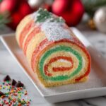 - Garnish and Serve: Before serving, dust the top of the cake roll with powdered sugar and decorate with sprinkles, chocolate shavings, or any festive holiday garnishes of your choice.