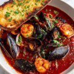 Cioppino shines with simple sides that highlight its robust flavor. Crusty bread is essential—it invites you to savor the velvety broth to the very last drop. A crisp green salad or sautéed garlic spinach complements the richness with lightness and freshness.