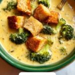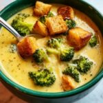 This Creamy Broccoli Cheddar Soup is a comforting, velvety blend of tender broccoli, sharp cheddar, and Parmesan cheese in a rich, buttery base. Made with simple ingredients and cooked on the stovetop, it’s perfectly hearty and ideal for cozy lunches or dinners. The soup is thickened with a classic roux made from butter and flour, with a touch of mustard powder and nutmeg to enhance the flavors, finished off with croutons for a satisfying crunch.