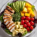 - Add Protein and Vegetables: Top the greens in organized rows or sections with the diced cooked chicken breast, quartered hard-boiled eggs, diced avocado, halved cherry tomatoes, sliced cucumber, crumbled bacon, crumbled blue cheese, and thinly sliced red onion to create a colorful and appetizing presentation.