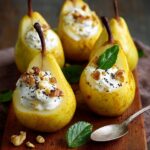 Top each stuffed pear with a sprinkle of finely chopped toasted walnuts or pecans, drizzle a little extra honey over the top, and if you’re feeling fancy, add a sprinkle of fresh chives. This not only adds texture and color but also layers in a subtle herbal brightness that elevates the dish’s overall flavor profile. Serve immediately and prepare for compliments!