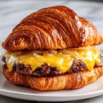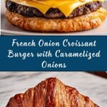 Savor the rich, gourmet flavors of this French Onion Croissant Burger featuring juicy ground beef patties topped with melted Swiss or Gruyère cheese, sweet caramelized onions, and a tangy mayo-mustard spread all nestled inside flaky buttery croissants. Perfect for an elevated burger experience that combines classic French and American tastes.