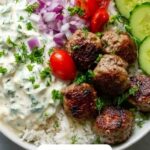 A vibrant Greek Meatball Bowl featuring tender lamb or beef meatballs seasoned with fresh herbs and spices, served over fluffy basmati or jasmine rice and topped with a refreshing homemade tzatziki sauce and crisp fresh vegetables. This wholesome and colorful dish brings together the best of Mediterranean flavors in a simple and satisfying meal perfect for lunch or dinner.