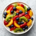 A refreshing and vibrant Honey Lime Fruit Salad featuring a colorful mix of strawberries, peaches, blueberries, and kiwis tossed in a sweet and tangy honey-lime dressing. Perfect for a quick, healthy snack or a light dessert.