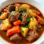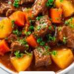 A sprinkle of freshly chopped parsley or thyme leaves adds a fresh, herbaceous touch that brightens up the stew’s rich, hearty flavors. If you want a little extra indulgence, a dollop of sour cream or a swirl of crème fraîche works beautifully as a creamy contrast.