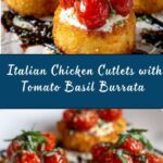 Crispy Italian Basil Chicken Cutlets topped with a vibrant tomato and burrata mixture. This recipe features tender chicken breasts breaded and fried to golden perfection, served with a fresh, flavorful topping of blistered cherry tomatoes, fragrant basil, and creamy burrata cheese, all finished with a tangy balsamic glaze.