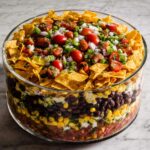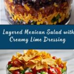 A vibrant and delicious Layered Mexican Salad featuring fresh vegetables, black beans, corn, and a zesty creamy dressing. Perfect for gatherings or a quick, nutritious meal, this salad is packed with colorful layers and topped with crunchy tortilla chips for texture.