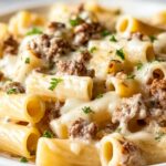 This Loaded Cheeseburger Alfredo Pasta combines the savory flavors of a classic cheeseburger with creamy Alfredo sauce, tossed with penne pasta for a rich and satisfying dish. Ground beef is browned and mixed with sautéed onions and garlic, then combined with a luscious cheese sauce featuring cheddar, mozzarella, and cream cheese, finished with crispy bacon and optional pickles for that authentic burger twist. Ready in just 30 minutes, this comfort food twist is perfect for a hearty family meal.