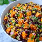 A vibrant and nutritious Roasted Sweet Potato Black Bean Quinoa Salad that combines the earthy sweetness of roasted sweet potatoes with protein-packed quinoa, black beans, and corn. Tossed in a zesty lime-cumin dressing with a hint of smoky paprika and optional Tajin seasoning, this salad is perfect for a healthy lunch or a satisfying side dish.