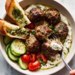 For a fun twist, serve the meatballs stacked on toasted baguette slices topped with a dollop of tzatziki and a spoonful of tomato salad—a bite-sized, party-perfect appetizer. Alternatively, create a casual family-style platter where everyone can dip meatballs into the green sauce and build their own delicious combinations.