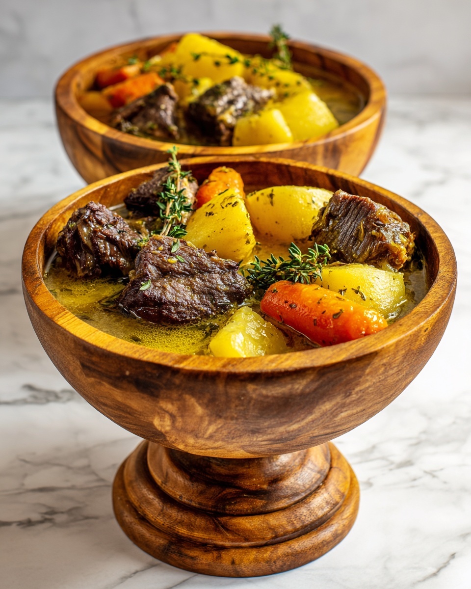 Keeping it classic works wonderfully here—a sprinkle of freshly chopped parsley or a few thyme leaves on top offers a fresh burst of color and herbal brightness that complements the hearty richness of the hotpot perfectly.