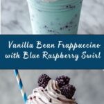 A deliciously creamy Vanilla Bean Frappuccino with a vibrant blue raspberry syrup swirl, perfect for a refreshing and colorful cold beverage. This easy-to-make frappuccino blends classic vanilla flavors with a fun, fruity twist.